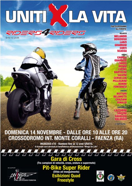I nomi dei concorrenti sono altisonanti: Tony Cairoli, Andrea Dovizioso, Marco Melandri, Chicco Chiodi, Davide Guarneri, Davide Gozzini, Ivan Lazzarini… E molti, moltissimi altri. Tutti “uniti”, con uno scopo comune: essere protagonisti di uno show, il cui ricavato verrà devoluto interamente alle associazioni senza scopo di lucro “Riders 4 Riders”, promotore dell’evento, e “Wings for Life”, ovvero due iniziative nate per raccogliere fondi per supportare cure e riabilitazioni di piloti che hanno subito lesioni gravi in seguito ad incidenti in pista.